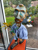 Vincent van Gogh war ein Getriebener, ein Visionär – und einer der eindrucksvollsten Künstler der Moderne. Seine Werke, geprägt von intensiver Farbe und emotionaler Tiefe, spiegeln eine innere Welt voller Licht und Dunkelheit. Die Pappmachéfigur zeigt ihn mit einer echten Sonnenblume in der Hand – ein poetisches Detail, das an eines seiner berühmtesten Gemälde erinnert. Die Figur strahlt zugleich Ruhe und Spannung aus, als würde Van Gogh selbst einen Moment innehalten, zwischen Inspiration und Zerbrechlichkeit. Ein kleines Kunstwerk in sich, das den Maler ehrt, ohne ihn zu verklären. Ausdrucksstark. Ehrlich. Und tief berührend.